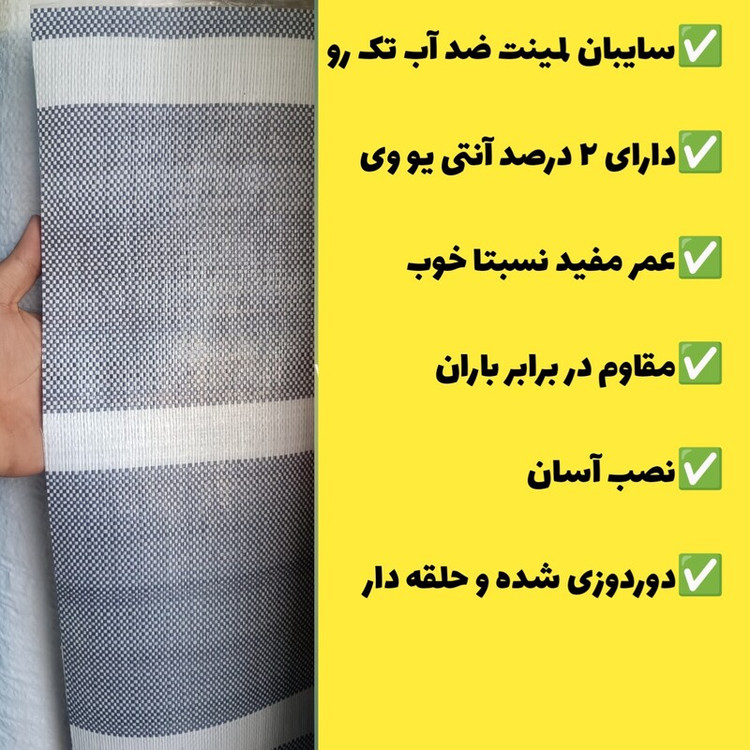 ✅سایبان لمینت ضد آب تک رو ✅دارای ۲ درصد آنتی یو وی ✅عمر مفید نسبتا خوب✅سایبان لمینت ضد آب تک رو ✅دارای ۲ درصد آنتی یو وی ✅عمر مفید نسبتا خوب ✅مقاوم در برابر باران ✅نصب آسان ✅دوردوزی شده و حلقه دار ✅مقاوم در برابر باران و برف ✅نصب آسان ✅دوردوزی شده و حلقه دار