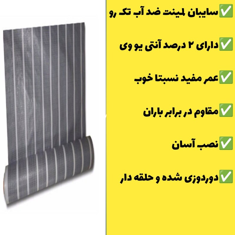 ✅سایبان لمینت ضد آب تک رو ✅دارای ۲ درصد آنتی یو وی ✅عمر مفید نسبتا خوب✅سایبان لمینت ضد آب تک رو ✅دارای ۲ درصد آنتی یو وی ✅عمر مفید نسبتا خوب ✅مقاوم در برابر باران ✅نصب آسان ✅دوردوزی شده و حلقه دار ✅مقاوم در برابر باران و برف ✅نصب آسان ✅دوردوزی شده و حلقه دار
