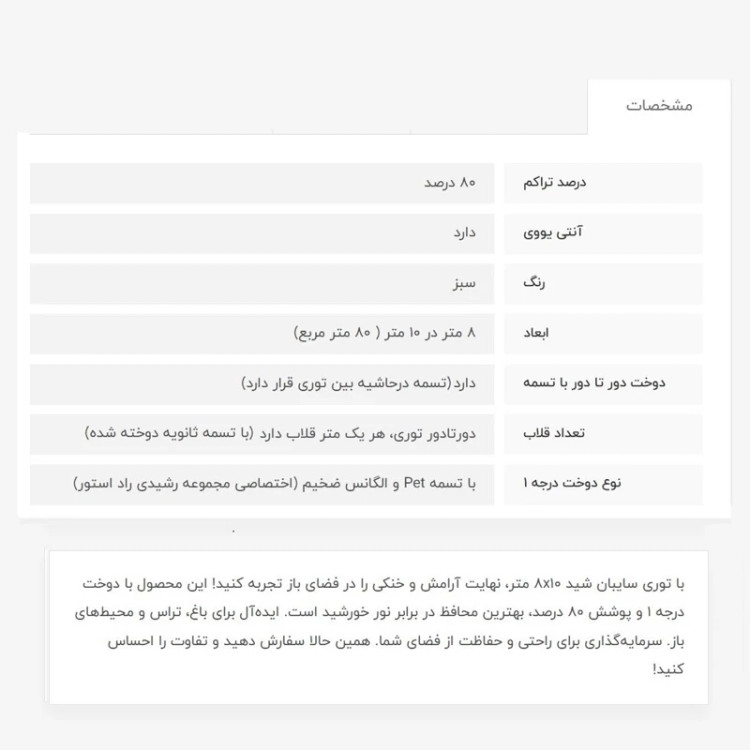 توری سایبان شید، 8در10، دوخت درجه1، 80درصد