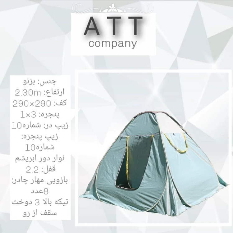 چادر مسافرتی 12 نفره A.T.T ارتفاع:220 cm کف: 290×290 1×3 پنجره تیکه بالا سه دوخت نوار دور ابریشم زیپ شماره 10 توری در و پنجره به همراه کیف مخصوص